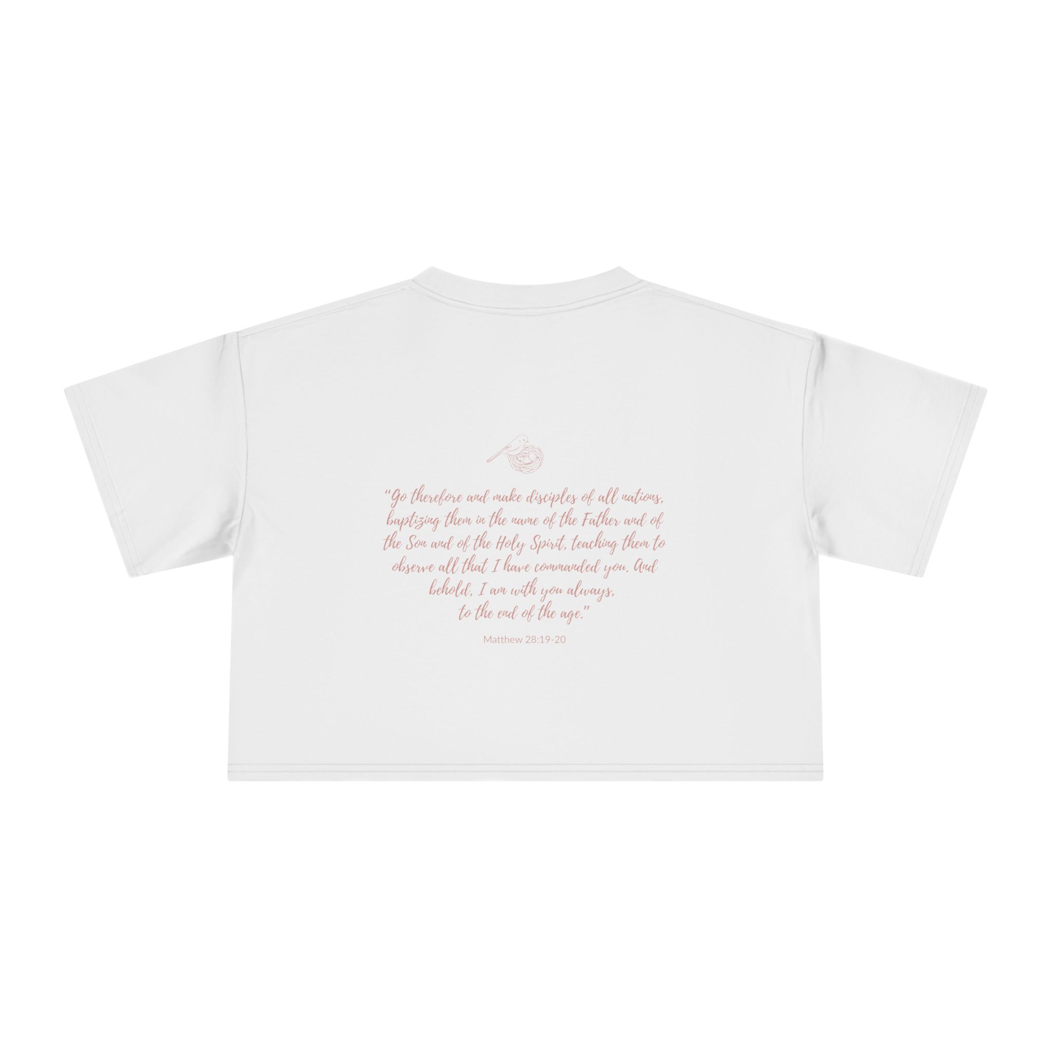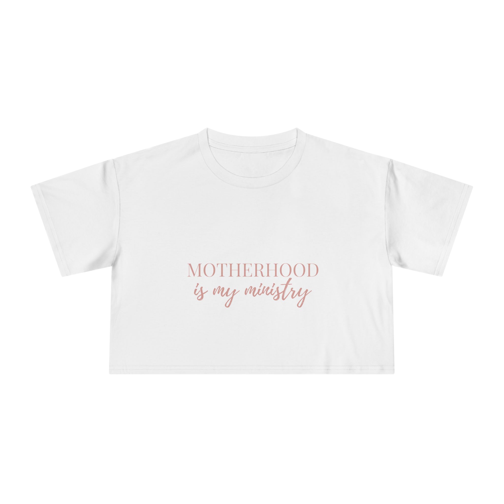 Motherhood is my Ministry Women's Crop Tee, Great Commission Christian Shirt, Pink and White Relaxed Fit, High-Waisted Jeans, Stylish quantity